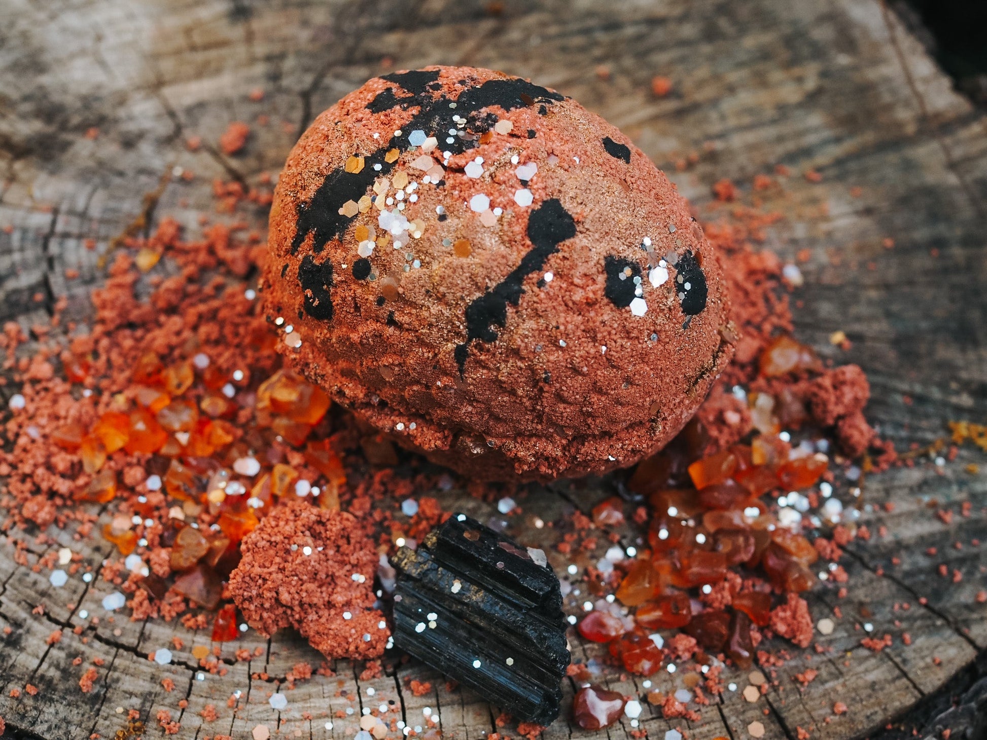 Inside is a rough Black Tourmaline, believed to have spiritual properties that protect against negative energy sprinkled with Carnelian chips to motivate and ground.