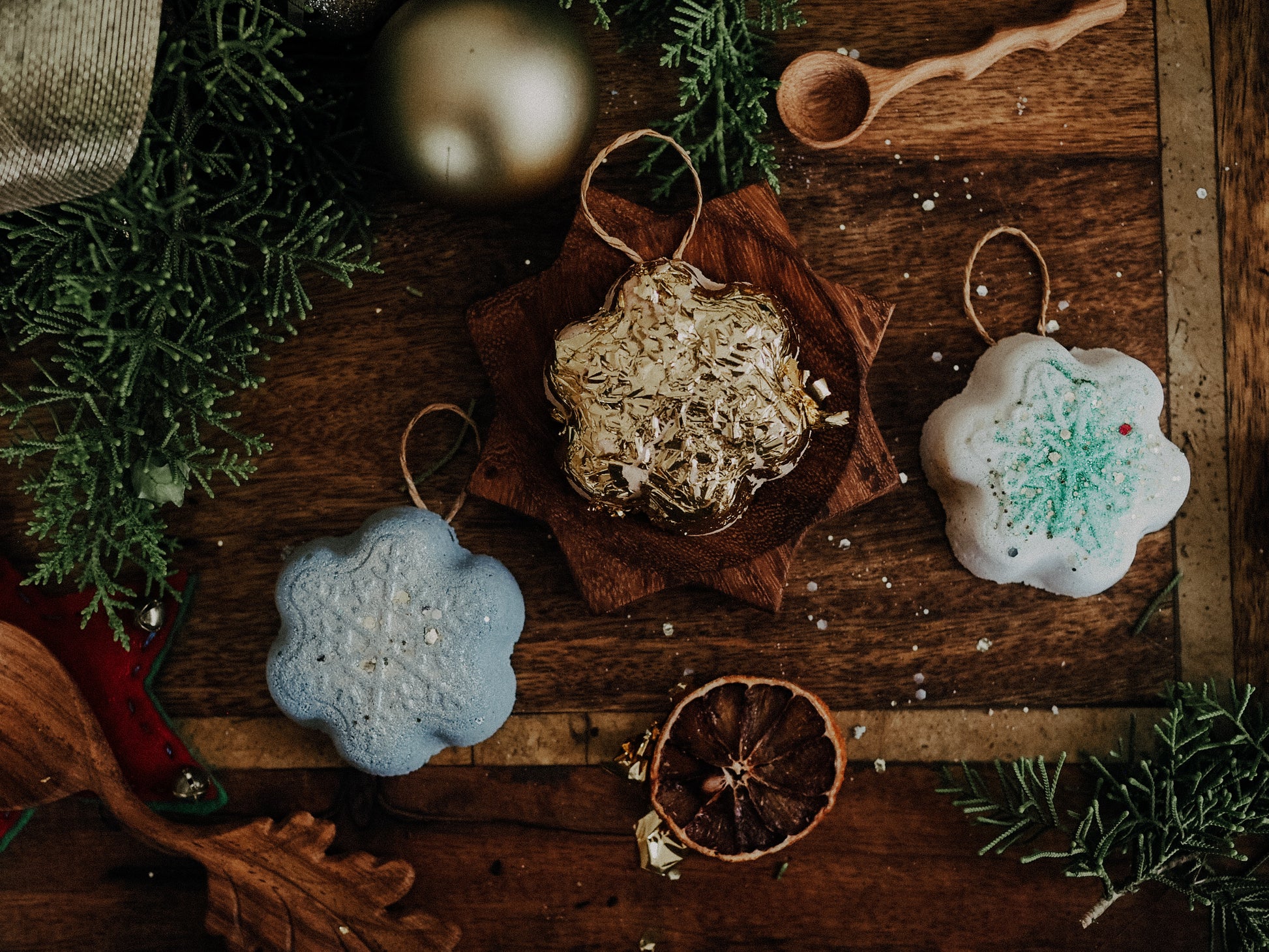 Three fizzy snowflake ornaments all with different crystals hidden inside.
